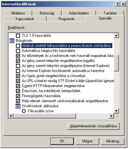 Görgessen a Böngészés / Ablakok ismételt felhasználása parancsikon indításához ponthoz és a sor elején lévő négyzetbe kattintva távolítsa el a pipát onnan!